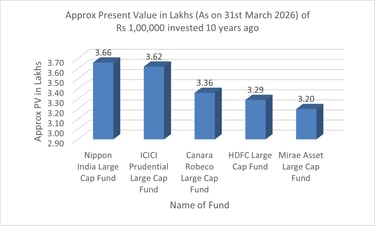 हालांकि म्यूचुअल फंड में रिटर्न की गारंटी नहीं होती, फिर भी यह कहा जा सकता है कि इन फंड्स ने निवेशक की सक्रिय भागीदारी के बिना तेजी से वृद्धि की। Nippon India Large Cap Fund, ICICI Prudential Large Cap Fund, Canara Robeco Large Cap Fund, HDFC Large Cap Fund और Mirae Asset Large Cap Fund ने पिछले 10 वर्षों में 3 गुना से अधिक रिटर्न दिए हैं।