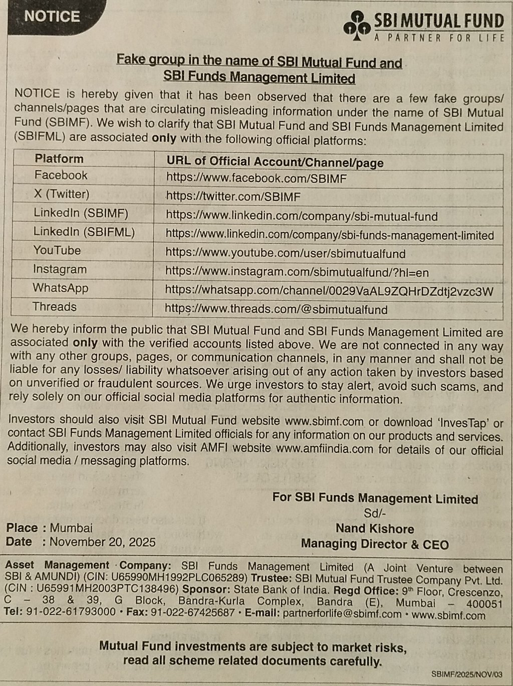 बसंत पंचमी, जिसे वसंत पंचमी के नाम से भी जाना जाता है, हमारे जीवन में गहन महत्व रखती है। यह एक जीवंत हिंदू त्योहार है जो वसंत के आगमन की घोषणा करता है और माघ मास की शुक्ल पक्ष की पाँचवीं तिथि को मनाया जाता है। यह त्योहार देवी सरस्वती को समर्पित है जो ज्ञान, विद्या, संगीत, कला और अध्ययन की प्रतीक हैं। यह दिन हमें यह याद दिलाता है कि हमें प्रकृति के नवीनीकरण के बीच बौद्धिक विकास और रचनात्मक अभिव्यक्ति को अपनाना चाहिए। केवल रीतियों तक ही सीमित न रहकर, यह सटीक निर्णय लेने की प्रेरणा देता है क्योंकि यह विवेक और स्पष्टता को बढ़ावा देता है। जैसे वसंत पुराने पत्तों को हटा कर नए कली को जगह देता है, यह त्योहार हमें संदेह, डर और आवेगपूर्ण आदतों जैसे सोशल मीडिया पर बढ़िया निवेश योजनाओं पर तुरंत भरोसा करने, को छोड़ने के लिए प्रेरित करता है। हाल ही में, SBI Mutual Fund ने निवेशकों और जनता को समाचार पत्र नोटिस के माध्यम से धोखाधड़ी करने वाले सोशल मीडिया खातों, चैनलों और पेजों के बारे में चेतावनी दी है जो SBI Mutual Funds (SBIMF) और SBI Funds Management Limited (SBIFML) के नामों का दुरुपयोग कर रहे हैं। SBIMF और SBIFML ने इस धोखाधड़ी का पर्दाफाश करते हुए विभिन्न प्लेटफॉर्म्स पर अपने आधिकारिक और सत्यापित खातों/चैनलों/पेजों की एक सूची भी जारी की है।
