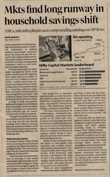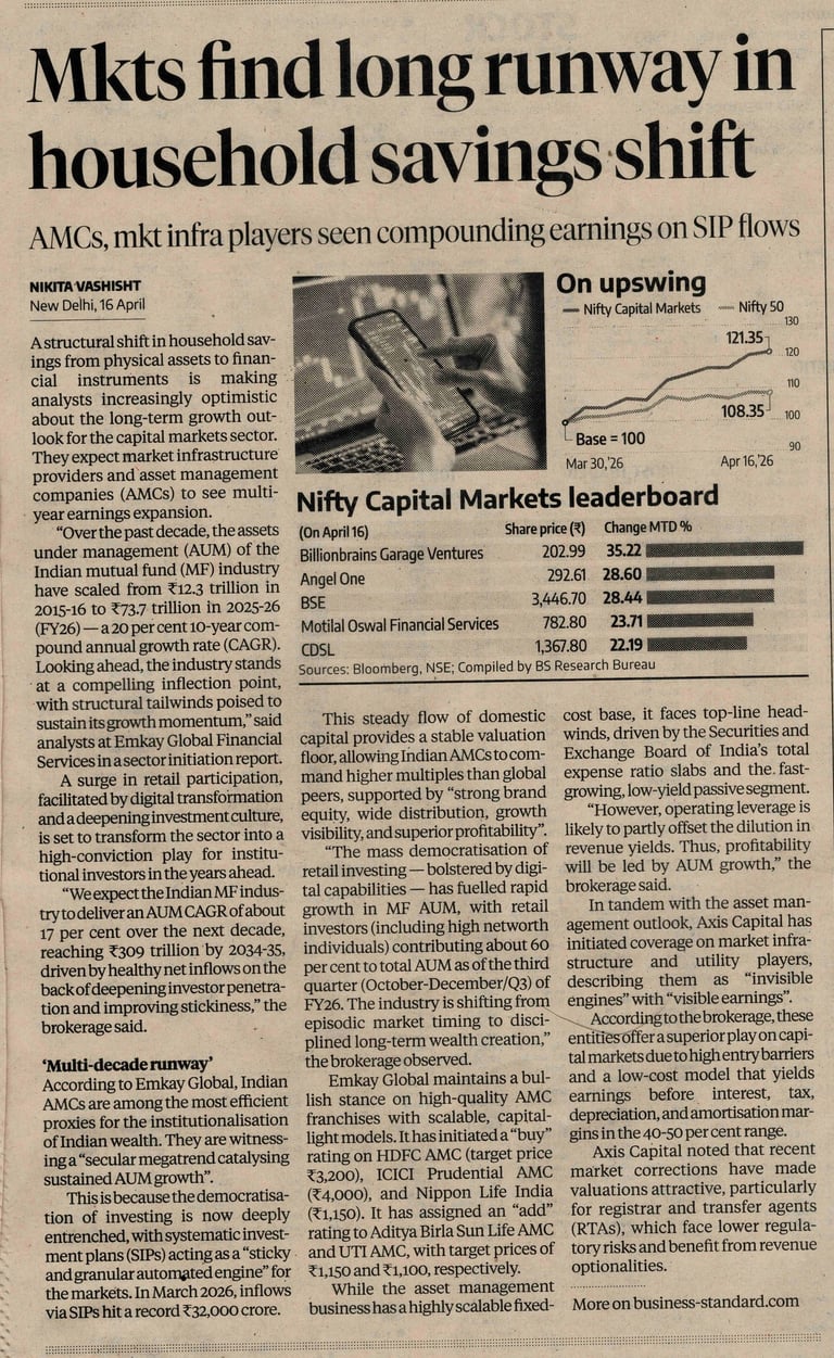 बिज़नेस स्टैंडर्ड की एक हालिया रिपोर्ट बताती है कि यह संरचनात्मक बदलाव एसेट मैनेजमेंट कंपनियों (AMC) और मार्केट इंफ्रास्ट्रक्चर संस्थानों जैसे स्टॉक एक्सचेंज, डिपॉजिटरी और रजिस्ट्रार के लिए दीर्घकालिक विकास की बड़ी संभावना पैदा कर रहा है। इस बदलाव के पीछे कोई सट्टा या अल्पकालिक उत्साह नहीं है, बल्कि भारतीय परिवारों में औपचारिक निवेश (Formal Investing) को लेकर बढ़ती हुई अनुशासनात्मक सोच है।