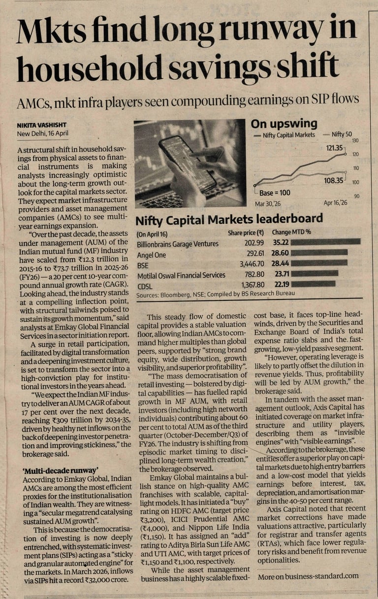 A recent Business Standard report highlights how this structural shift is creating long-term growth potential for Asset Management Companies (AMCs) and market infrastructure institutions such as stock exchanges, depositories, and registrars. The key driver behind this transition is not speculation or short-term enthusiasm; it is the increasing discipline of Indian households in formal investing.