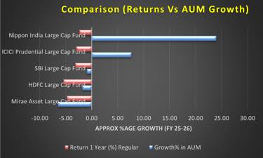 Let me explain this to you through a very simple example. Let us take five Large-cap Mutual Funds (with the largest AUMs as on 31st March 2026) and compare their last one-year returns to AUM Growth :