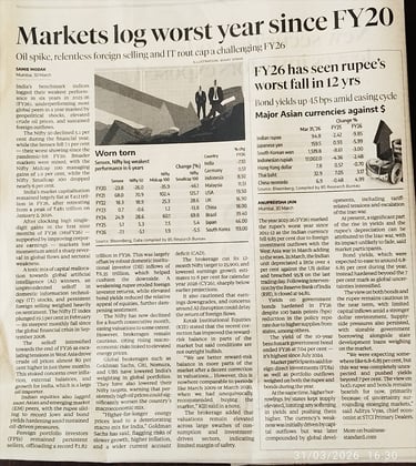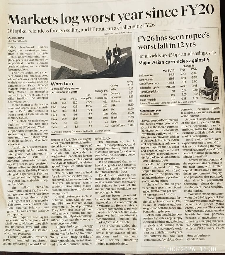 FY26 has been a reminder that equity investing is not about “always going up.” As highlighted in the Business Standard article, Indian markets witnessed their weakest performance since FY20. The Sensex declined 7.1% and the Nifty 50 fell 5.1%, driven by multiple factors such as crude oil spikes, persistent foreign selling, currency weakness, and global uncertainty.